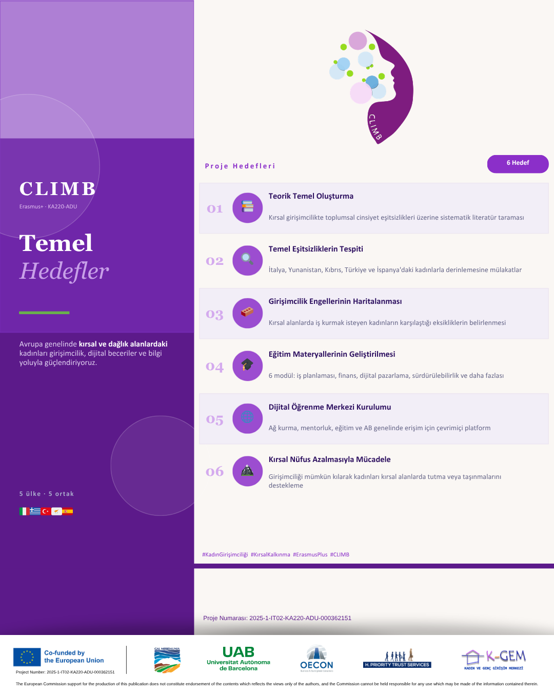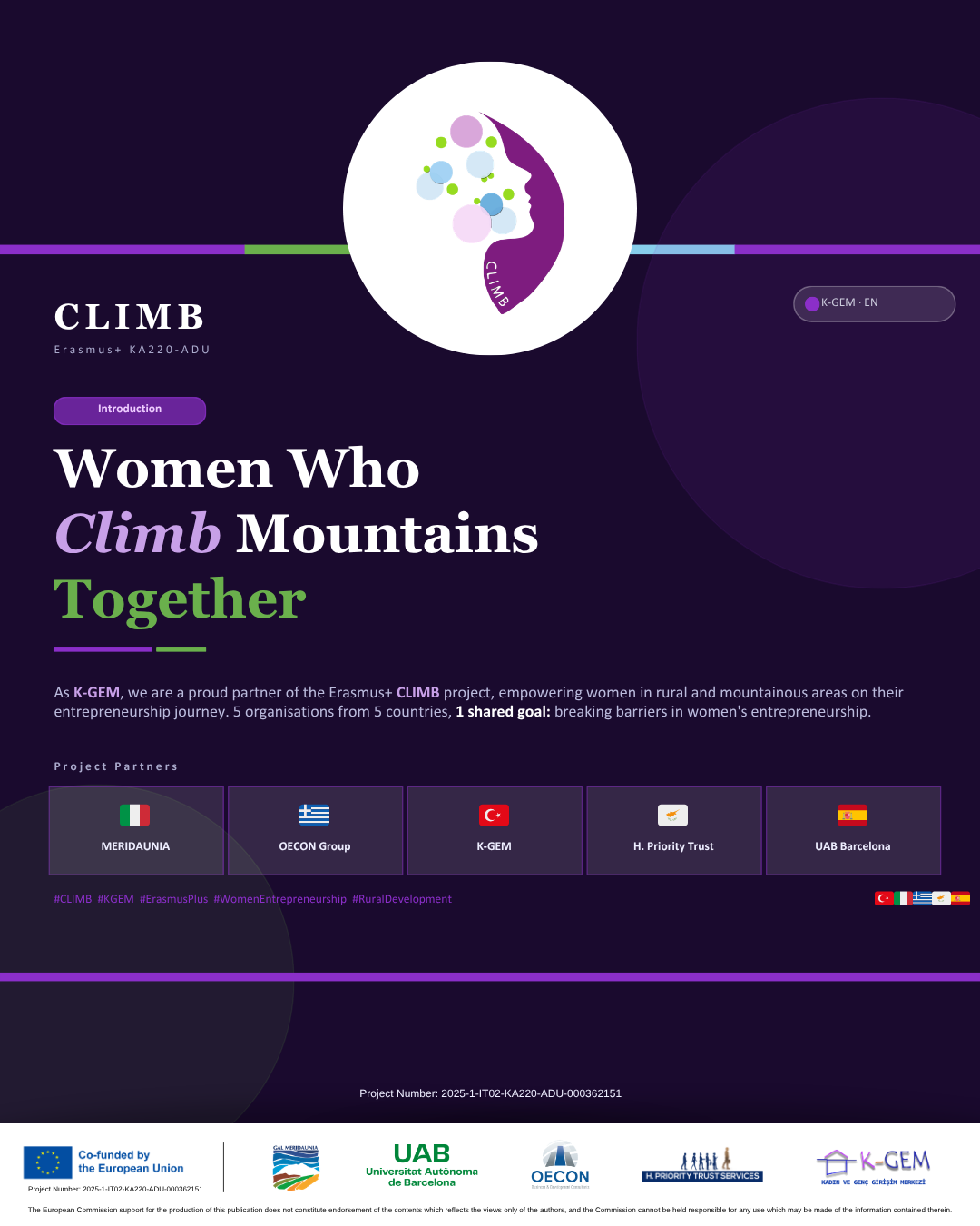 Avrupa Birliği Erasmus+ programı kapsamında desteklenen 2025-1-IT02-KA220-ADU-000362151 numaralı CLIMB (Empowering Women to Climb the Entrepreneurial Mountains in Remote Areas) projesi ile kadın girişimciliğini destekliyoruz. Avrupa’nın 5 farklı ülkesinden 5 ortak kuruluşla yürüttüğümüz bu çalışma, kırsal ve dağlık bölgelerdeki kadınların girişimcilik yolculuğunu güçlendirmeyi hedefliyor.